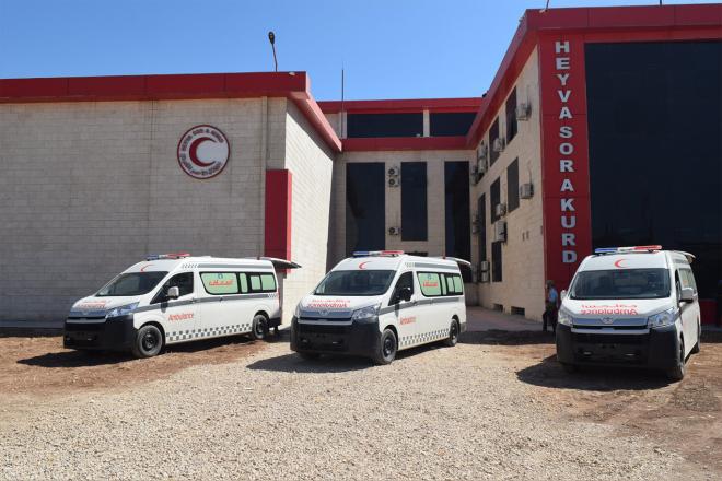 سيارات الإسعاف المجهزة بالمعدات تضاف إلى دعم فرنسي لمشاريع صحية في المنطقة خلال الفترة الماضية، بحسب الهلال الأحمر الكردي.