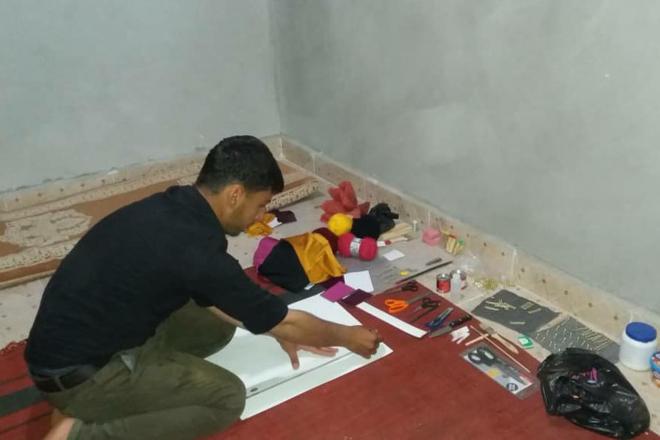 "تتكون معدات العمل من صناديق الكرتون الفارغة، وأعواد الأسنان، وقطع من القماش التالف، بالإضافة إلى خيوط ملونة وقطع خشبية وبعض حبات الخرز وقطع القصدير. الخطوة الأولى هي غراء الكرتون بطبقات كبيرة لتسميكه، وبعدها أقوم بقص المجسم المطلوب للسفينة التي أقوم بصناعتها، ثم أقوم بلصق قطعة القماش عليها. يستمر هذا العمل لمدة يومين، وفي اليوم الثالث أقوم بتفصيل الأشرعة للسفينة، ووضع المرساة من أعواد طويلة، وبعدها أقوم بصنع السلالم للسفينة عن طريق أعواد الأسنان."