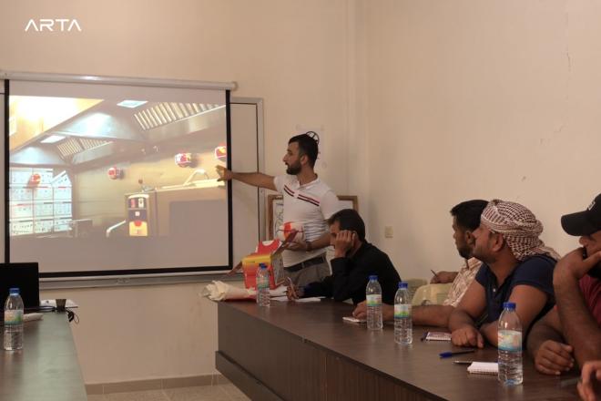 وتضمن البرنامج التدريبي الذي استمر، يومين، دروساً نظرية حول طبيعة الحرائق وكيفية التعامل معها، وفقاً للمدرب، محمد الأحمد، الحاصل على شهادة خبرة في هذا المجال من وكالة (إدارة السلامة والصحة المهنية) في الولايات المتحدة الأمريكية.
