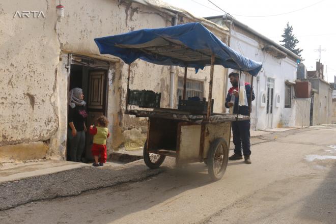 يمضي محمد علي، البالغ من العمر 45 عاماً، معظم نهاره متجولاً بعربته الصغيرة ليبيع الفول والحمص لسكان المالكية / ديريك، من أجل تأمين لقمة العيش لأطفاله وزوجته.