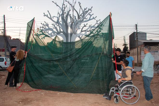 نَصْبُ المجسّم والاحتفاء بإزاحة الستارة عنه تمّ بالتنسيق مع جمعية جدائل خضراء، وجمعية Art Situ الفرنسية، وبحضور شخصيات فنية وثقافية.